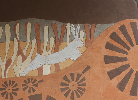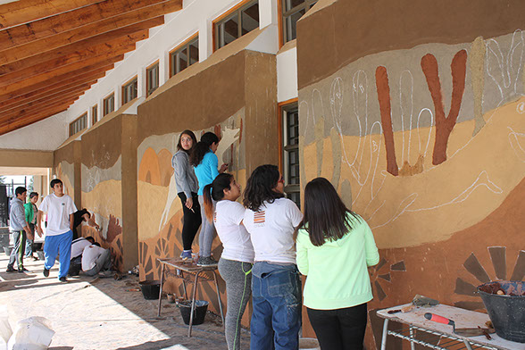 Proyecto de intervención en el espacio público de la Biblioteca de Machigüe con la colaboración de 26 alumnos de segundo año medio del liceo local, capacitándolos en las técnicas de revoque fino con tierra y pinturas de arcilla. Se realiza un mural que contempla la totalidad de la superficie de la fachada principal del edificio consistente en 7 paños de 3x3,7 mts. alcanzando una superficie total de 77,7 m2.