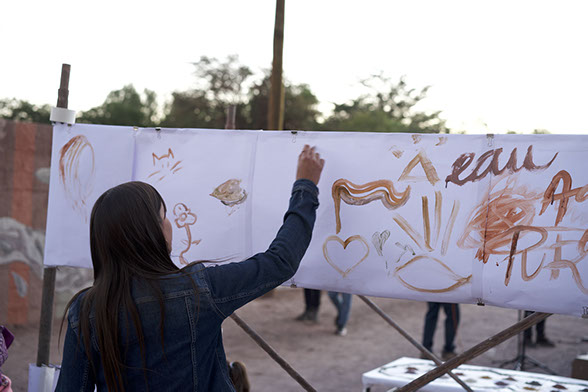 Se realizó un llamado a diseño participativo , donde se decidió tomar como temática el agua , en el largo que abarca el mural , se rescata el agua y los elementos que vitales que el agua sostiene , el mural parte con una mujer que reza una hoja de coca , esta hoja viaja por los 80 metros de largo del mural , pasando por el vuelo de un flamenco , un hombre que recibe la lluvia, animales que beben el agua , niños jugando con ella , paisajes naturales caracterizados por la abundancia de agua, un hombre que recibe la hoja de coca frente a las lagunas y finalmente una mujer con su telar que recoge todo el relato del agua en su tejido.