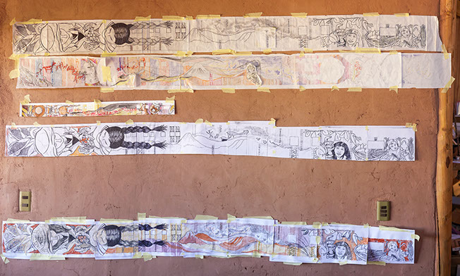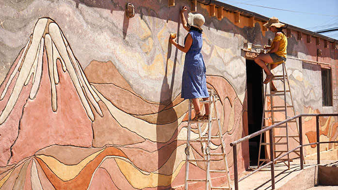 Este mural fue realizado con tierras de colores recolectadas alrededor de San Pedro de Atacama, se usaron las técnicas de revoque fino y pintura de tierra a base de pigmentos, se realizaron reuniones de diseño participativo online , donde los participantes reconocieron la crisis que se vivía a raíz del corona virus, los participantes reconocieron un volver a lo básico, al alimento, a la tierra, también se reconoció el conflicto social que vive san pedro de atacama, la Zenofobia, el no acoger al que viene de afuera. Este muro contiene el primer mural de Pangea Fundación basado en la leyanda del licancabur y la kimal , este es de 21 m2 , los que se integrarán a los 120m2 restantes manteniendo diseño original.
